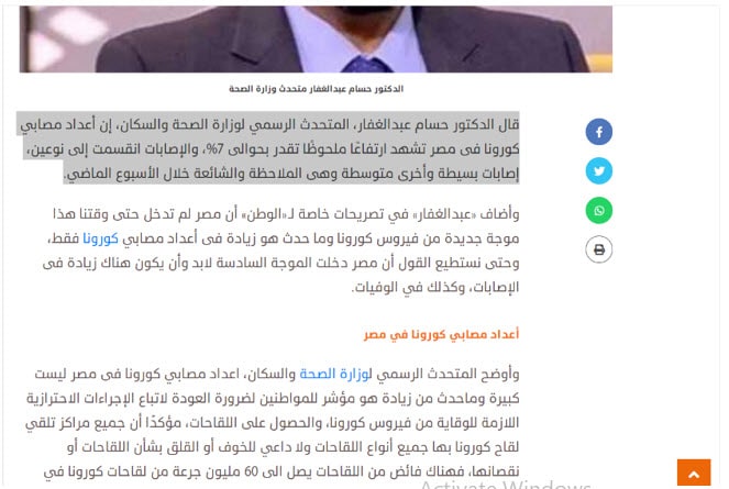 وأوضح المُتحدث الرسمي باسم وزارة الصحة المصرية، لموقع "الوطن"، في يوم 14 يوليو 2022، أن أعداد مصابي كورونا في مصر تشهد ارتفاعًا ملحوظًا يقدر بحوالي 7%، وأن الإصابات انقسمت إلى نوعين، إصابات بسيطة وأخرى متوسطة وهي الملاحظة والشائعة خلال الاسبوع الماضي.