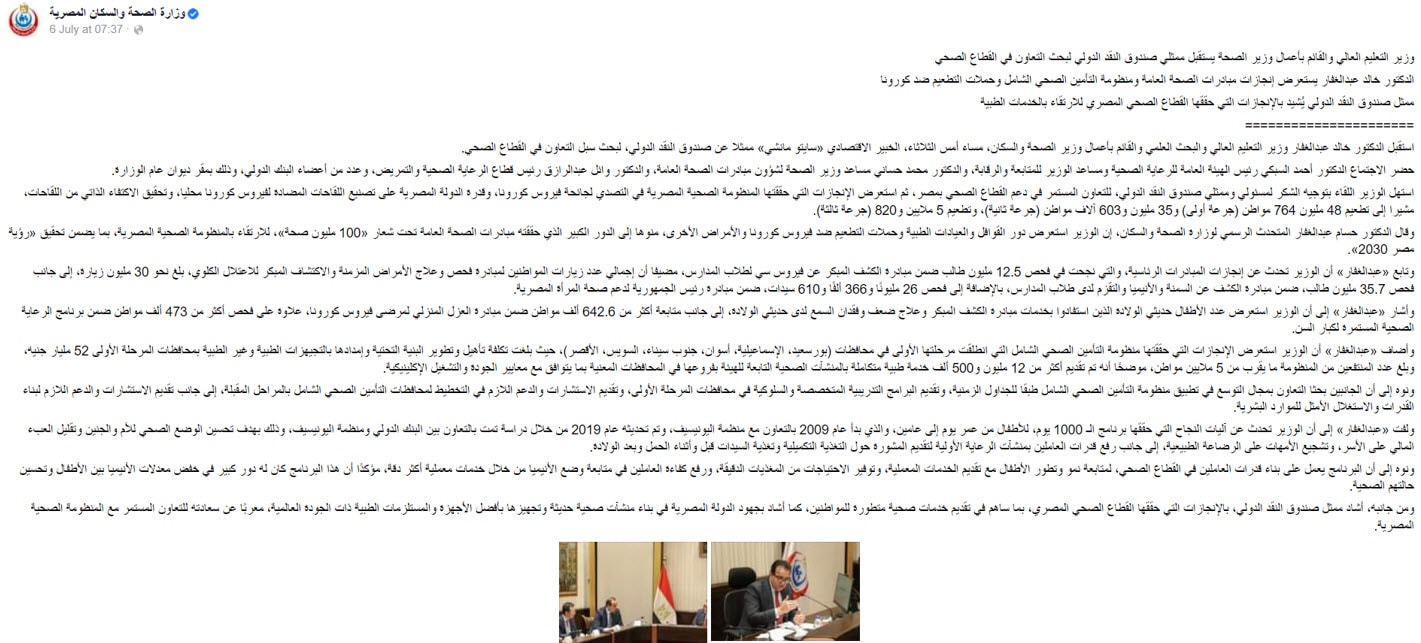 في 6 يوليو 2022 أعلن القائم بأعمال وزير الصحة والسكان المصري، تطعيم 48 مليونًا و764 مواطنُا بالجرعة الأولى من لقاح كورونا، و35 مليونًا و603 آلاف مواطن بالجرعة الثانية، وتطعيم 5 ملايين و820 ألفًا بالجرعة الثالثة، وذلك عبر لقائه بممثل صندوق النقد الدولي، والذي نُشر على صفحة الوزارة على موقع "فيسبوك".