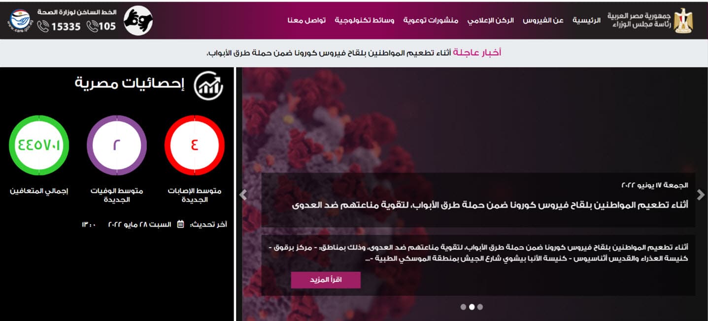 وفقًا لمركز المعلومات ودعم اتخاذ القرار التابع لرئاسة مجلس الوزراء المصري، في آخر تحديث له يوم 28 مايو 2022، بلغ متوسط الإصابات الجديدة بفيروس كورونا 4 حالات، ومتوسط الوفيات الجديدة حالتان، وإجمالي المتعافين 445 ألفًا و701 متعافي.
