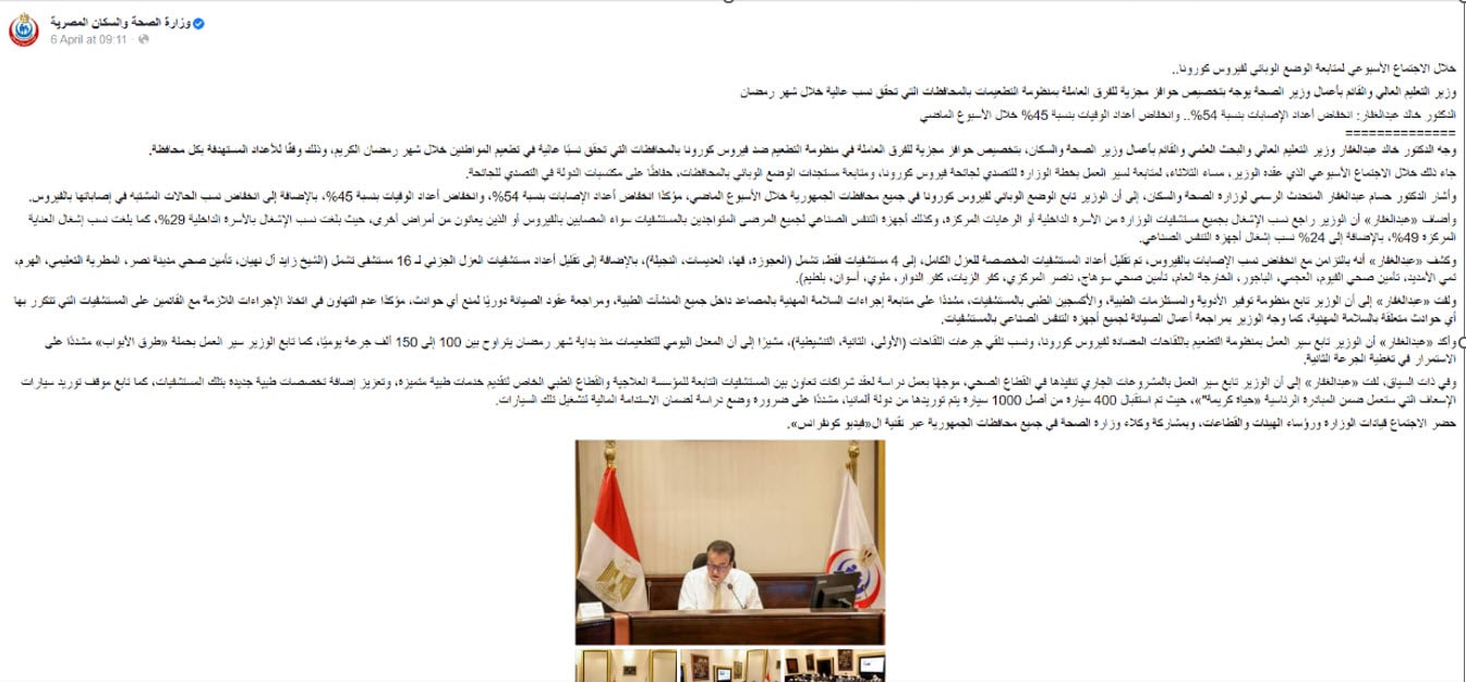 وأوضح تقليل أعداد مستشفيات العزل الجزئي لـ16 مستشفى هي "الشيخ زايد آل نهيان، وتأمين صحي مدينة نصر، والمطرية التعليمي، والهرم، وتمي الأمديد، وتأمين صحي الفيوم، والعجمي، والباجور، والخارجة العام، وتأمين صحي سوهاج، وناصر المركزي، وكفر الزيات، وكفر الدوار، وملوي، وأسوان، وبلطيم".
